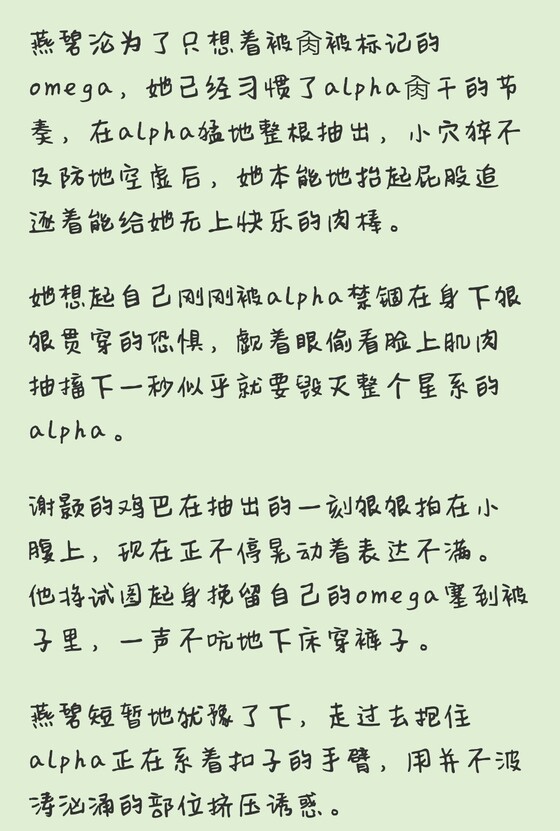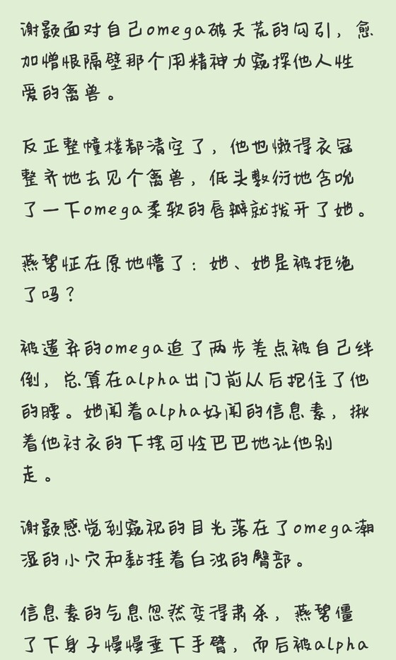 轻轻嗅着空气中残留的青草味,谢颍再次闭上yan回忆刚刚jiao小的omega被alpha整个覆盖住爆cao1的画面。