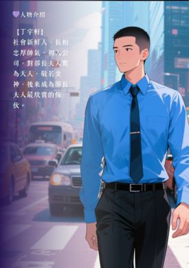 丁宇軒,社會新鮮人,長相忠厚帥氣,初入公司,對bu長夫人驚為天人,敬若女神,後來成為bu長夫人最欣賞的傢伙。