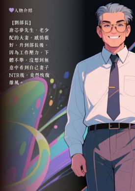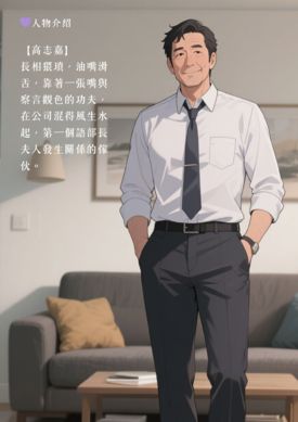 高志嘉,長相猥瑣,油嘴huashe2,靠著一張嘴與察言觀se的功夫,在公司混得風生水起,第一個語bu長夫人發生關係的傢伙。